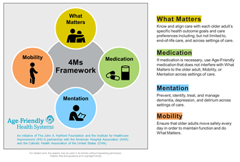 The 4Ms — What Matters, Medication, Mentation, and Mobility — make care of older adults that can be complex, more manageable. The 4Ms identify the core issues that should drive all care and decision making with the care of older adults. They organize care and focus on the older adult’s wellness and strengths rather than solely on disease. The 4Ms are relevant regardless of an older adult’s individual disease(s). They apply regardless of the number of functional problems an older adult may have, or that person’s cultural, ethnic, or religious background.